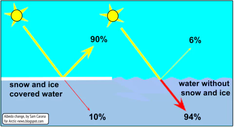 알비도감소에 따른 빙하, 빙상의 용해와 해수면 상승은 지구 표면의 힌 부분이 줄어들어 태양복사에너지가 더 지구에 흡수되기 때문입니다. 즉 흰 색은 빛을 반사하고 검은색은 빛을 흡수합니다. 빛을 반사하는 표면이 점점 줄어듬에 따라 더 많은 양의 태양복사에너지가 지구에 흡수됩니다. 이로 인하여 영구동토층의 해빙으로 매장된 메테인이 대기 중으로 분출되어 온난화가 가속될 수 있다고 합니다. 이로 인하여 정체불명의 고대 세균 및 바이러스의 출현으로 예상치 못한 팬데믹 상황을 맞을 가능성도 증가합니다. 삼림의 파괴 또한 청색 계열 햇빛이 더 지구에 흡수되게끔 하므로 알비도 감소에 영향을 줍니다.
